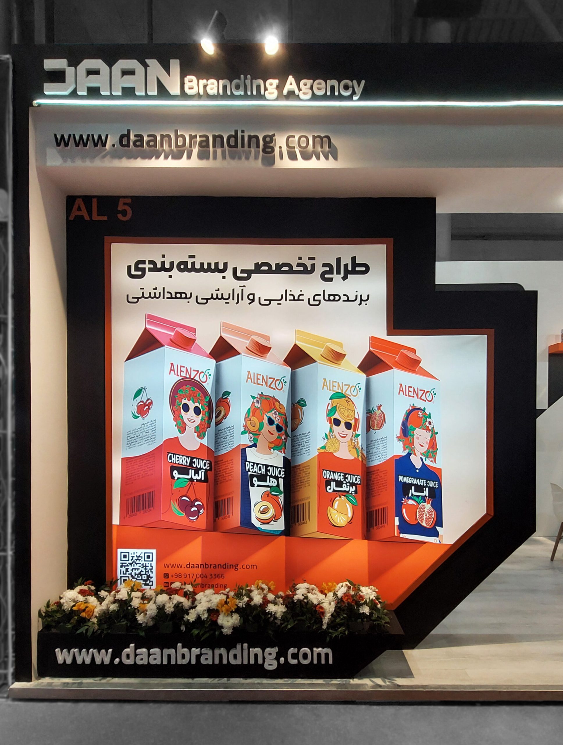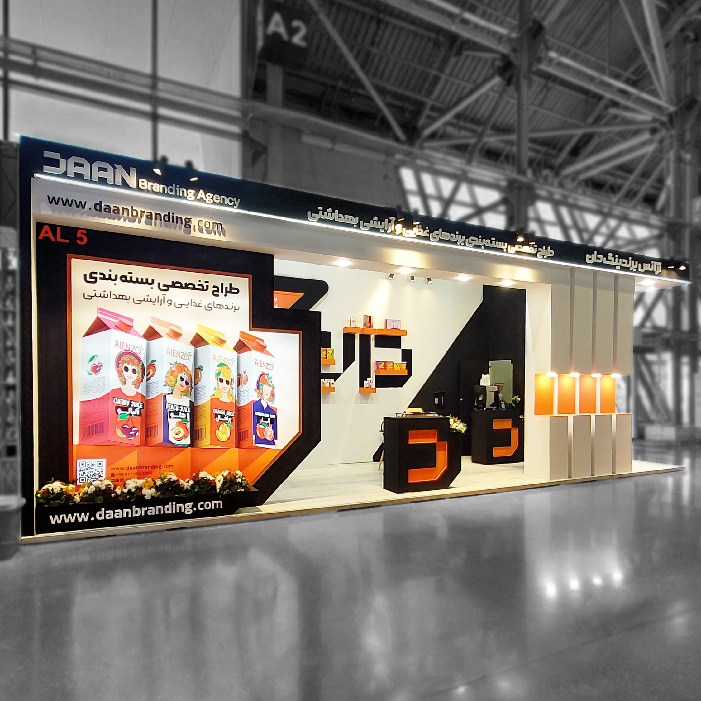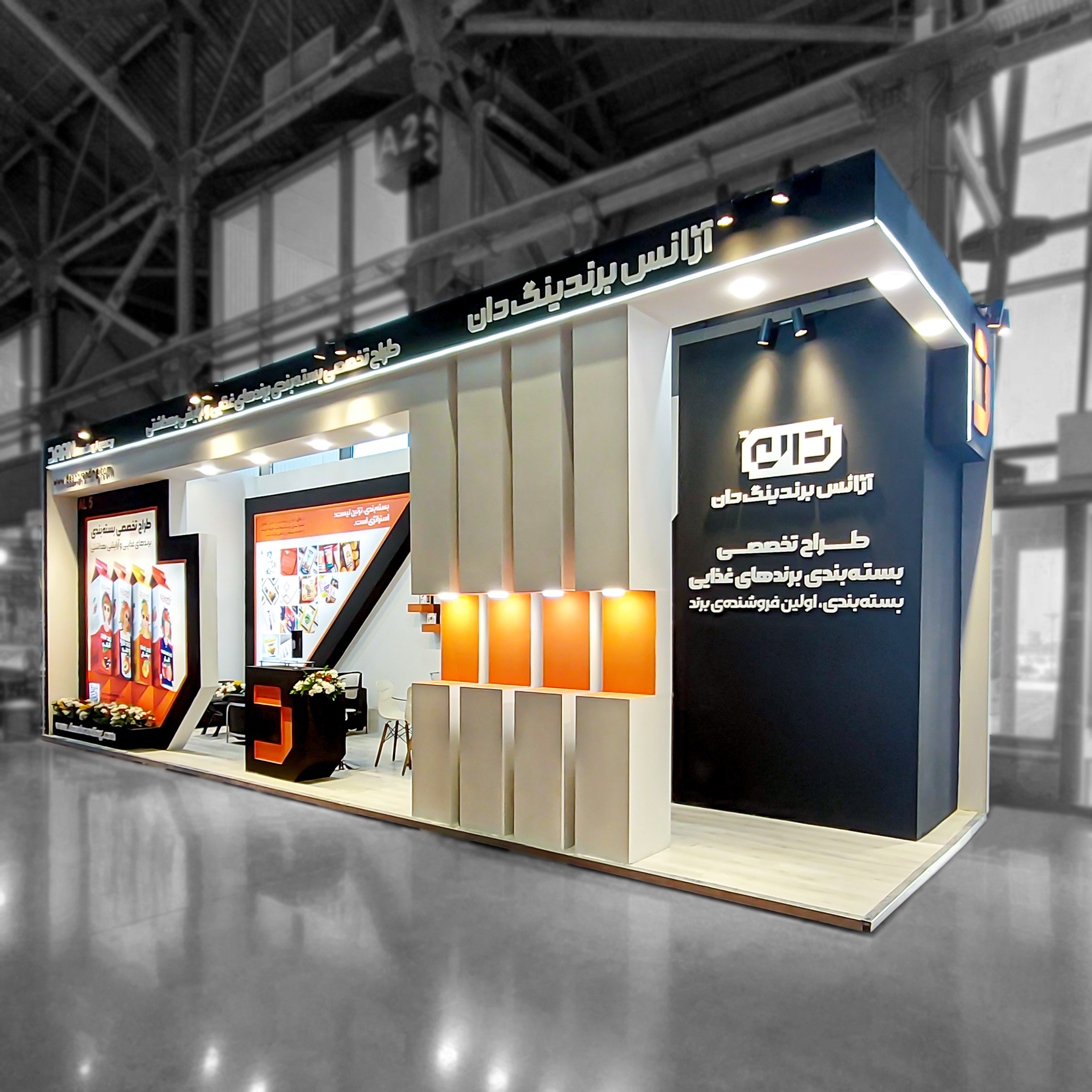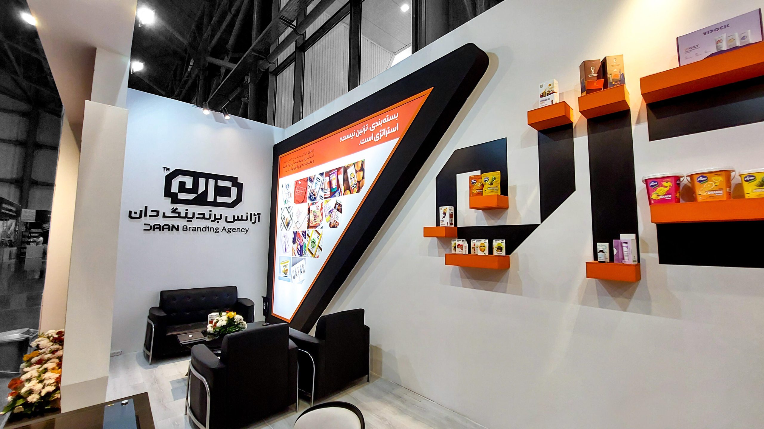 ✅ هویت بصری منسجم: در طراحی غرفه، از رنگهای سازمانی و عناصر گرافیکی برند استفاده شد تا هویت آژانس برندینگ دان بهطور کامل در فضا منعکس شود.