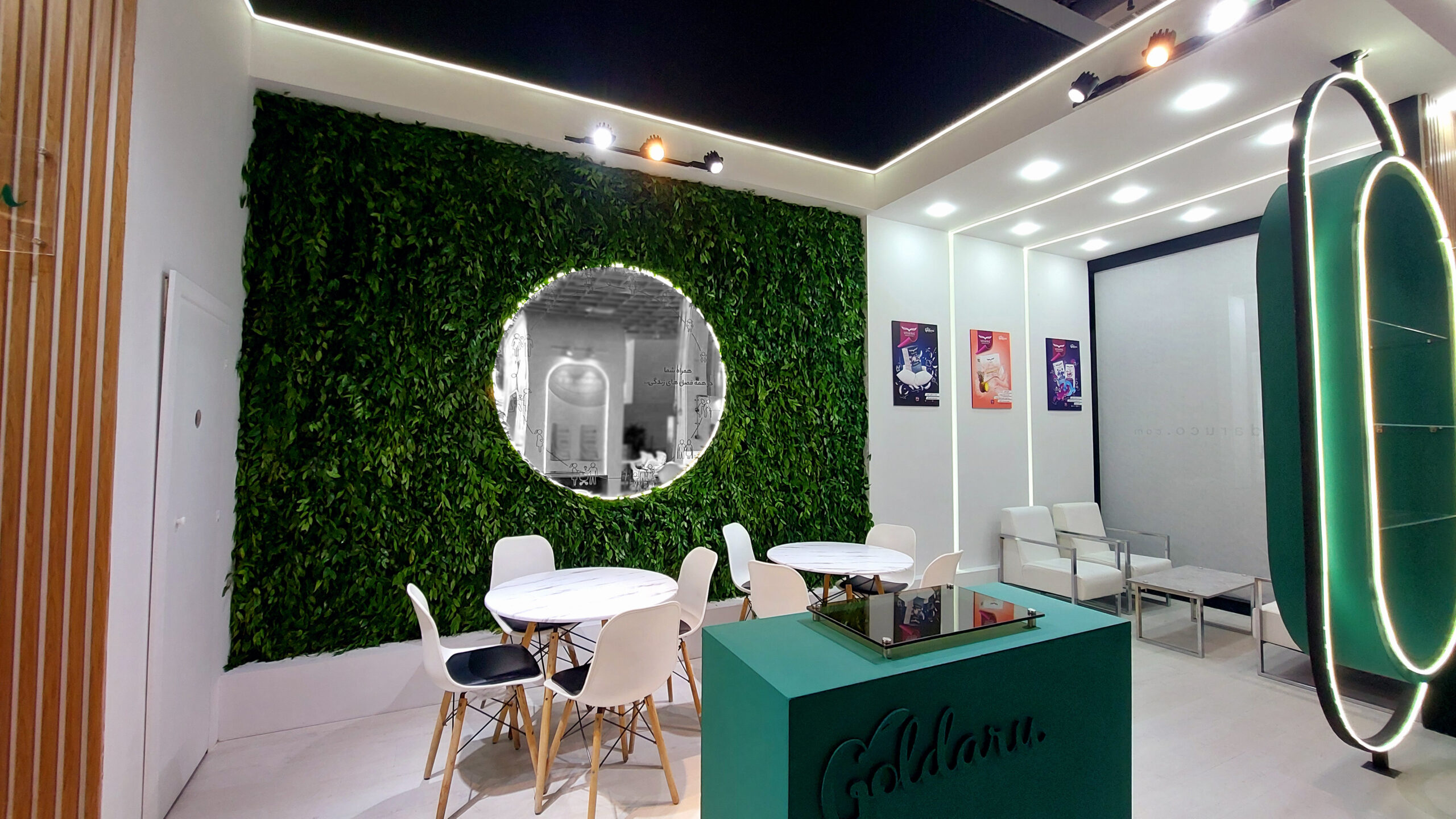 استفاده از آینه با ابعاد بزرگ به دلیل ضوابط و قوانین ایمنی کارگاهی، یک چالش برای غرفه سازان به حساب می آید. ما در ایرانا با درنظر گرفتن تمامی ضوابط و قوانین، آینه ای گرد به قطر 1.5 متر را در غرفه گلدارو اجرا کردیم که نصب این آینه در مرکز یک گرین وال بزرگ و زیبا، باعث خیرگی و جذابیت دوچندان این غرفه گردید.